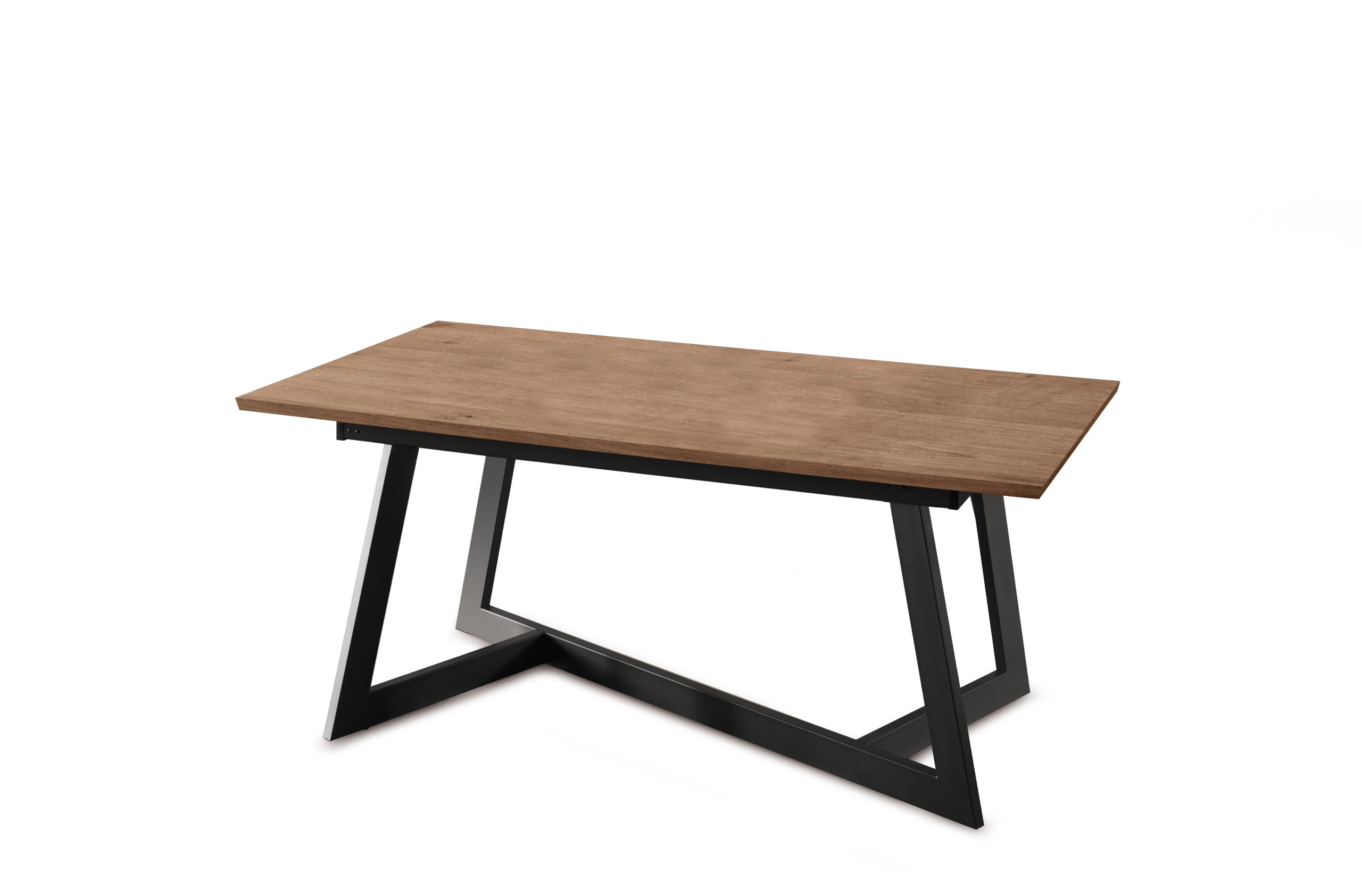 Rectangular top available in versions with top in brushed knotted oak and melamine-faced chipboard. The legs are in matt black painted metal