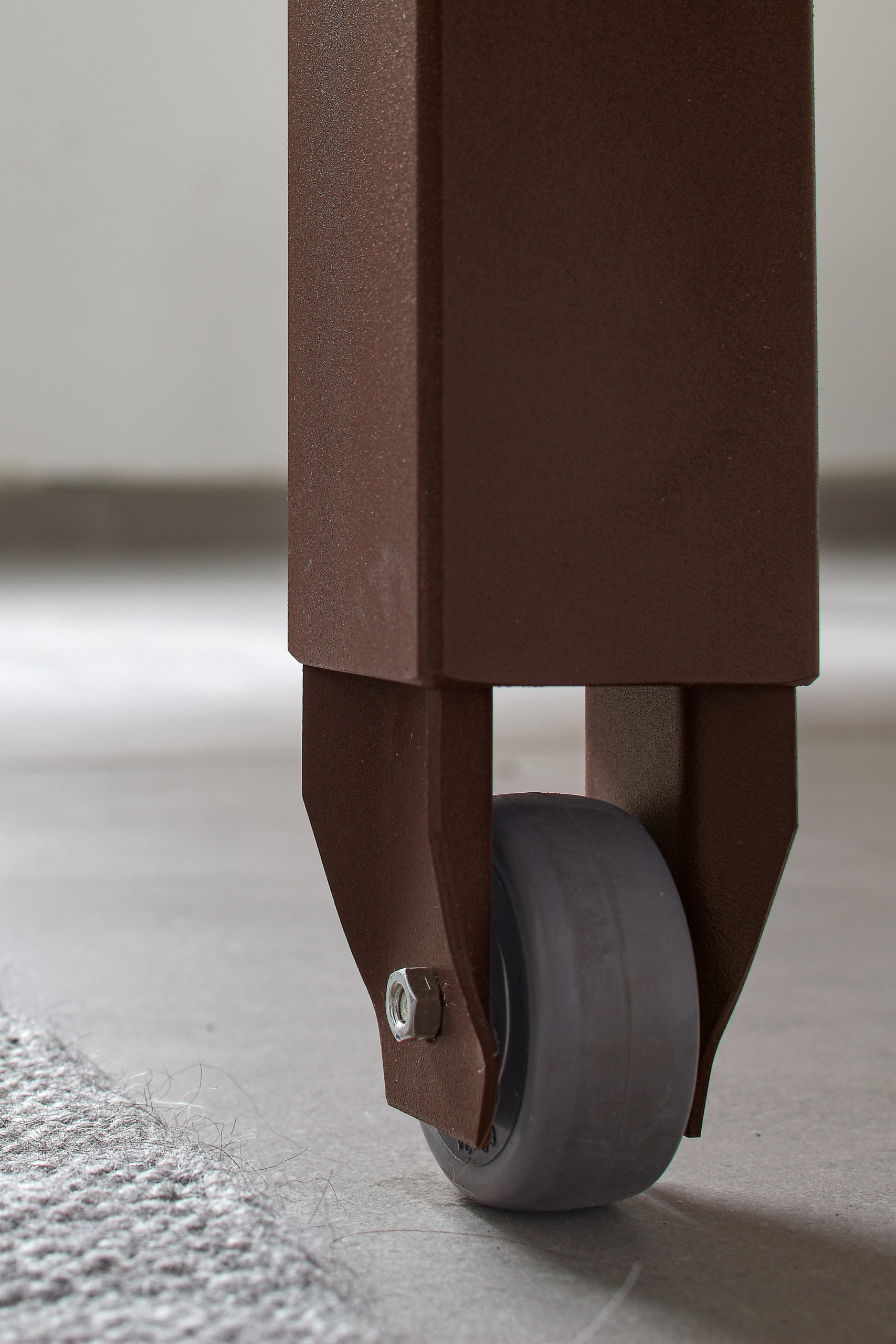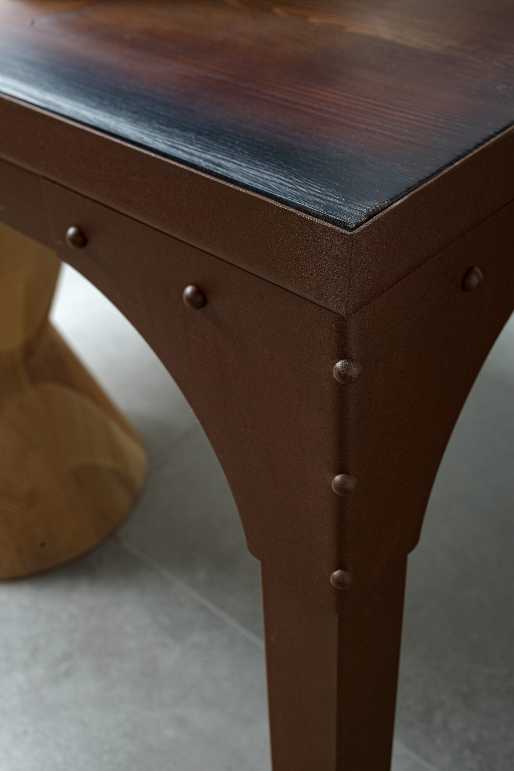 Table with rectangular solid fir wood top burnt effect. Finishing Corten effect on varnished metal legs and frame.
