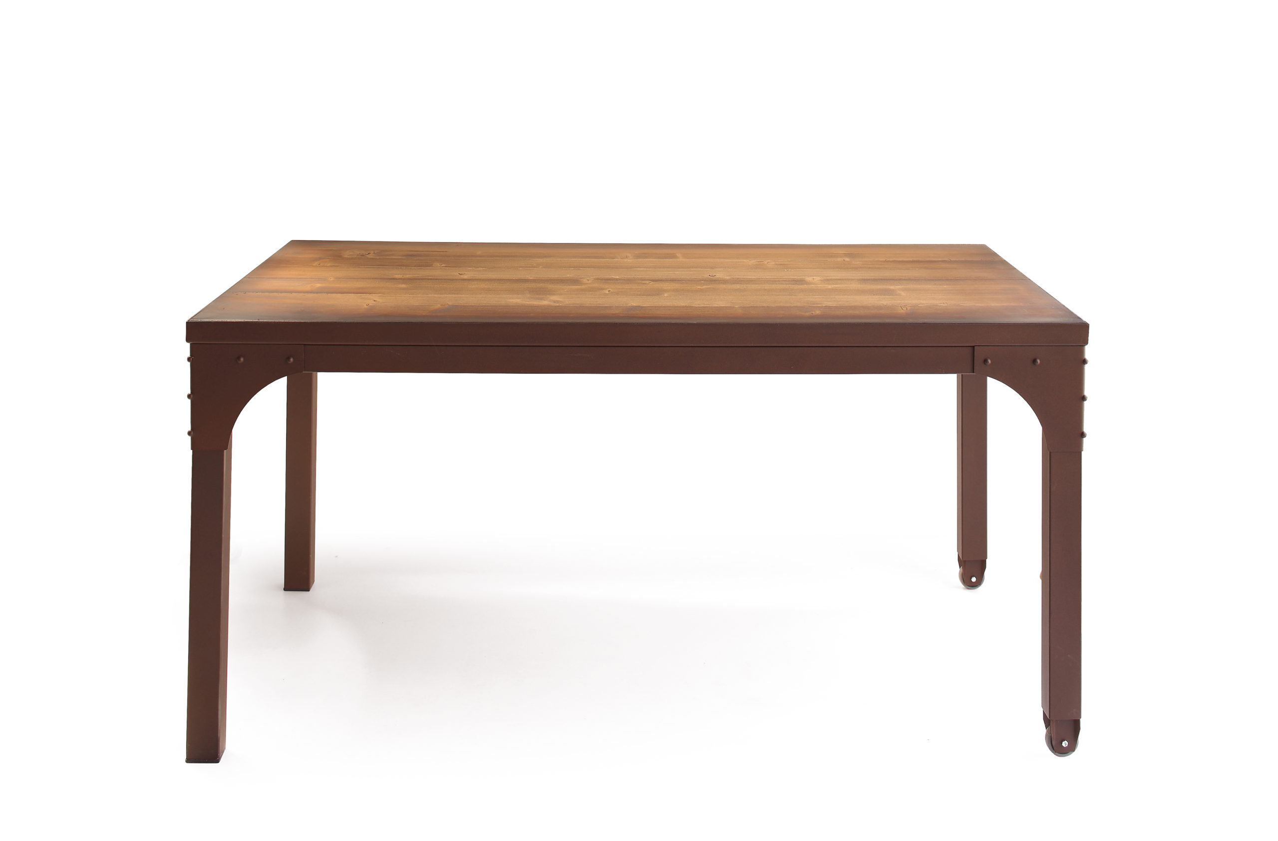 Tavolo con piano rettangolare in Abete massiccio finitura effetto bruciato. Gambe e struttura in metallo lucidate Corten.