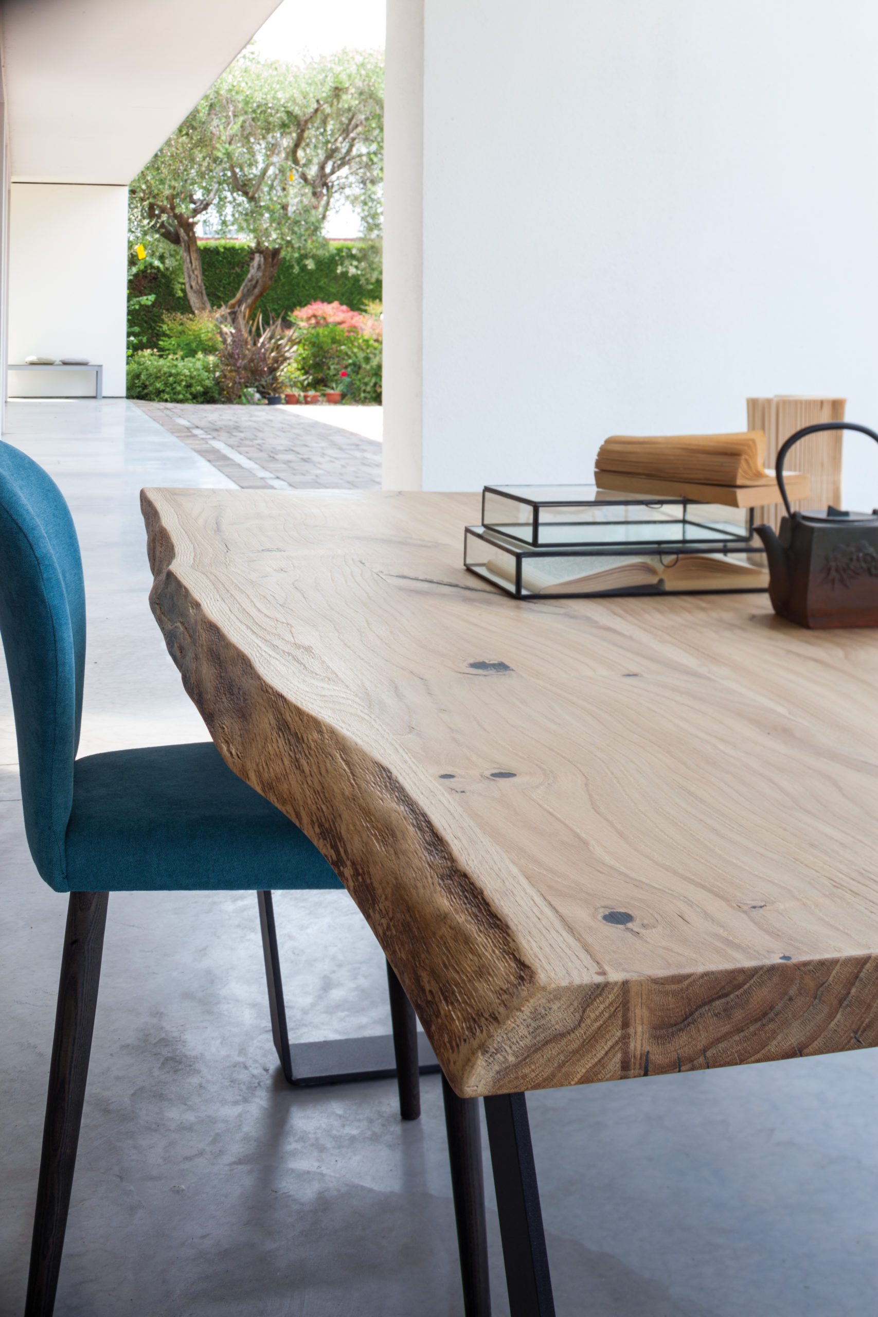 The Wood table top is available both in the solid oak wood version and in the cheaper version in knotted oak veneered chipboard, both fixed and extendable, the base is in painted metal. top in olive ash chipboard, solid ash legs.