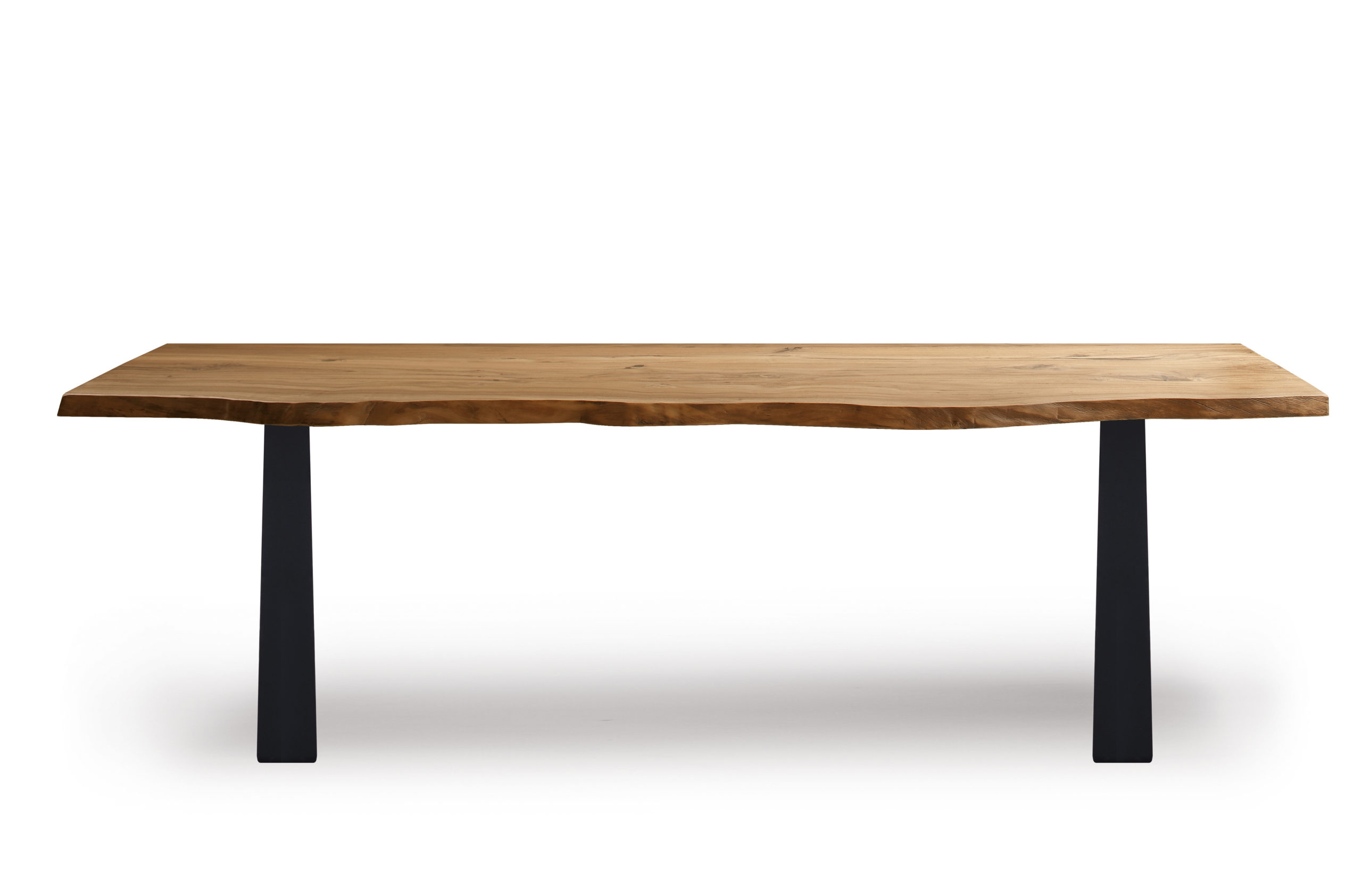 Il piano del tavolo Wood è disponibile sia nella versione in legno di rovere massiccio sia nella versione più economica in truciolare impiallacciato rovere nodato, sia fisso che allungabile, il basamento è in metallo verniciato.